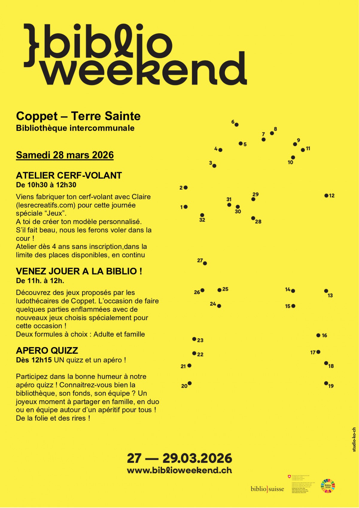 Dans le cadre du Biblioweekend 2026, qui met les bibliothèques suisses sous un projecteur le temps d'un week-end, votre bibliothèque intercommunale a concocté le programme ci-joint pour le 28 mars 2026.